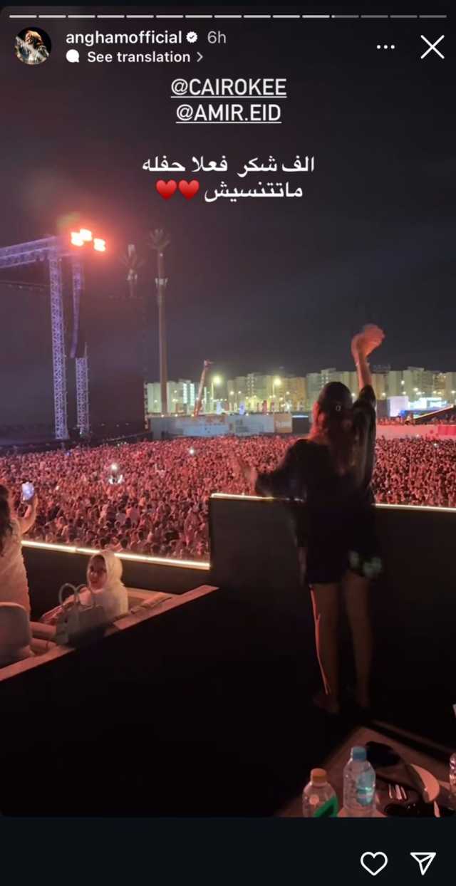وعلّقت أنغام عبر خاصية الاستوري، بعدما وجه أمير عيد تحية لها متمنيا دوام الصحة، وكتبت: «ألف شكر.. فعلًا حفلة متتنسيش».