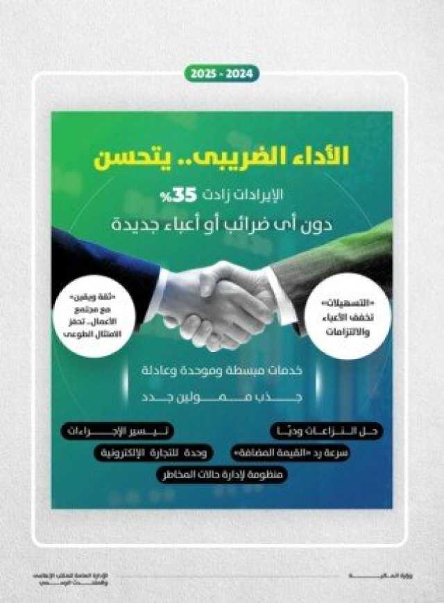 وقال الوزير، فى مؤتمر صحفي لاستعراض نتائج الأداء المالي للعام المالى 2024-2025، إن الإيرادات الضريبية زادت بنسبة 35٪ خلال العام المالي الماضي نتيجة لتجاوب مجتمع الأعمال معنا فى مسار الشراكة واليقين والثقة.