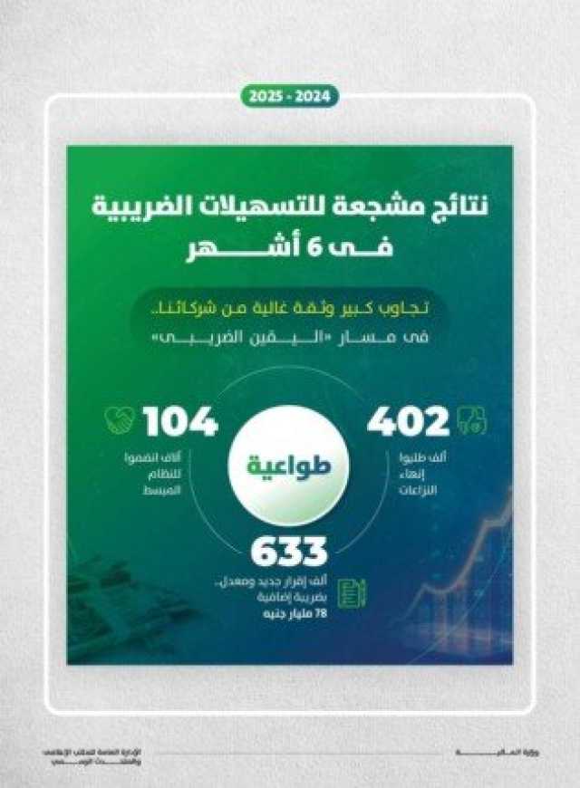 وأضاف الوزير، أن نتائج حزمة التسهيلات الضريبية فى 6 أشهر جاءت مشجعة، مما يدفعنا لاستكمال المشوار وإطلاق حزم متتالية من التيسيرات، موضحًا أن نحو 402 ألف طلبوا إنهاء النزاعات الضريبية و104 آلاف انضموا للنظام المبسط طواعية حتى الآن، وتم تقديم نحو 633 ألف إقرار جديد ومعدل بضريبة إضافية بقيمة 78 مليار جنيه «طواعية».