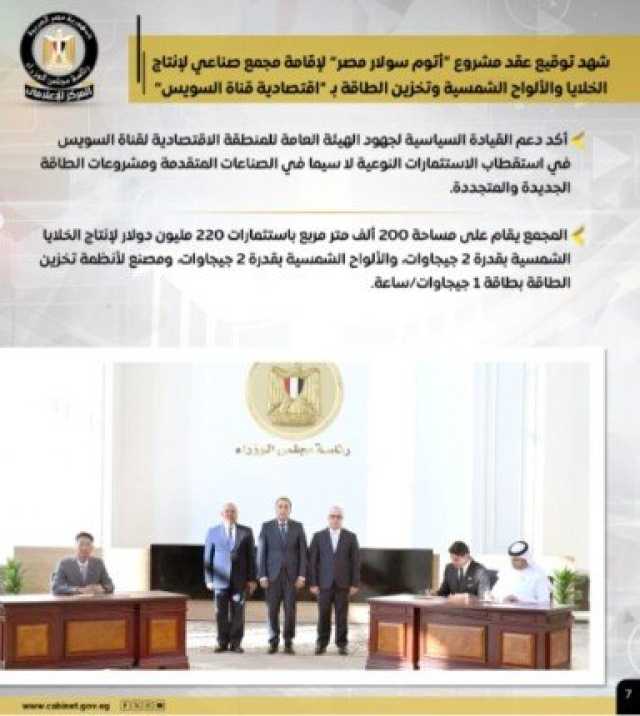 كما شهد الدكتور مصطفى مدبولي، توقيع عقد مشروع «أتوم سولار مصر» لإقامة مجمع صناعي لإنتاج الخلايا والألواح الشمسية وتخزين الطاقة بـ «اقتصادية قناة السويس»، وذلك على مساحة 200 ألف م2، وباستثمارات 220 مليون دولار لإنتاج الخلايا الشمسية بقدرة 2 جيجاوات، والألواح الشمسية بقدرة 2 جيجاوات، ومصنع لأنظمة تخزين الطاقة بطاقة 1 جيجاوات/ساعة.