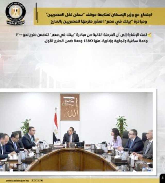 وعقد اجتماعًا مع وزير الإسكان لمتابعة موقف «سكن لكل المصريين» ومبادرة «بيتك في مصر» المقرر طرحها للمصريين بالخارج، وتمت الإشارة إلى أن المرحلة الثانية من مبادرة «بيتك في مصر» تتضمن طرح نحو 3000 وحدة سكنية وتجارية وإدارية، منها 1380 وحدة ضمن الطرح الأول.