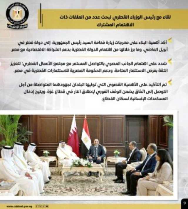 كما التقى مع رئيس الوزراء القطري، لبحث عدد من الملفات ذات الاهتمام المشترك، مؤكدًا أهمية البناء على مخرجات زيارة فخامة الرئيس إلى قطر في أبريل الماضي، وما برز خلالها من اهتمام الدولة القطرية بدعم الشراكة الاقتصادية مع مصر، فيما شدد سيادته على اهتمام الجانب المصري بالتواصل المستمر مع مجتمع الأعمال القطري، ودعم الحكومة المصرية للاستثمارات القطرية في مصر.