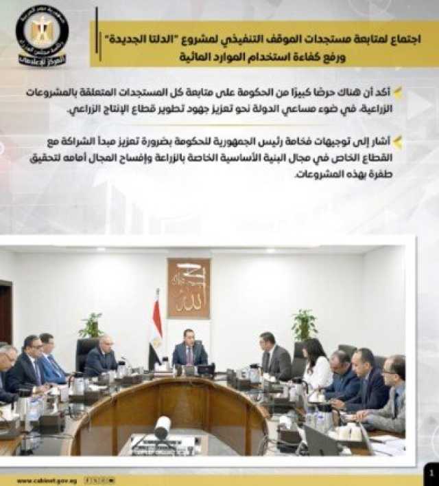 وتضمنت الأنشطة، اجتماع رئيس الوزراء، لمتابعة مستجدات الموقف التنفيذي لمشروع «الدلتا الجديدة» ورفع كفاءة استخدام الموارد المائية، حيث أشار إلى أن هناك توجيهات رئاسية بضرورة تعزيز مبدأ الشراكة مع القطاع الخاص في مجال البنية الأساسية الخاص بالزراعة، وإفساح المجال أمامه لتحقيق طفرة بهذه المشروعات.