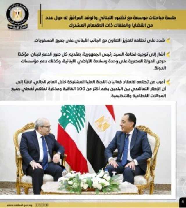 وعقد رئيس الوزراء جلسة مباحثات موسعة مع نظيره اللبناني والوفد المرافق له حول عدد من القضايا والملفات ذات الاهتمام المشترك، مشيرًا إلى توجيه الرئيس عبد الفتاح السيسي بتقديم كل صور الدعم للبنان، معربًا عن تطلعه لانعقاد فعاليات اللجنة العليا المشتركة خلال العام الحالي.