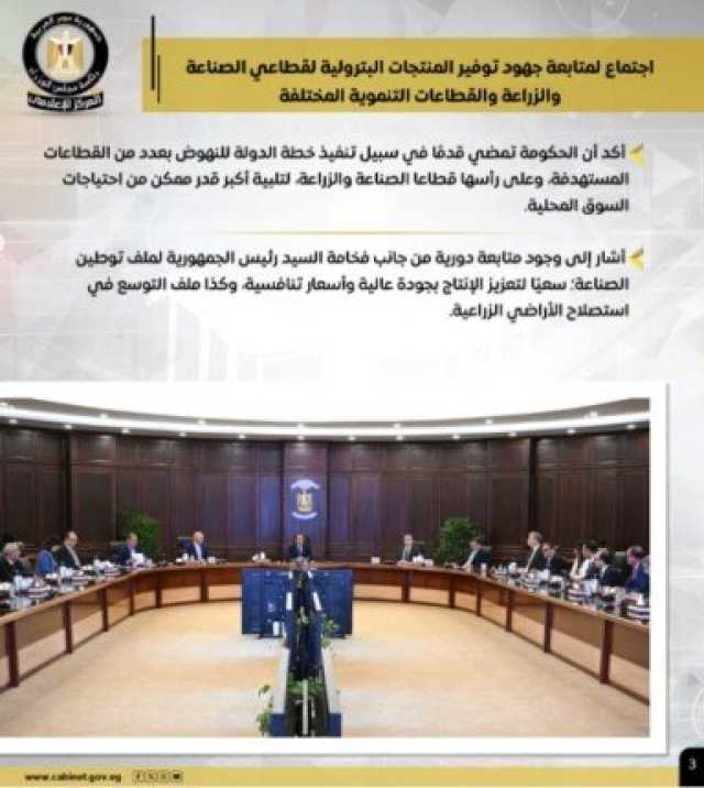وشملت الأنشطة، اجتماع رئيس الوزراء لمتابعة جهود توفير المنتجات البترولية لقطاعي الصناعة والزراعة والقطاعات التنموية المختلفة، مشيرًا إلى وجود متابعة دورية من جانب الرئيس لملف توطين الصناعة، سعيًا لتعزيز الإنتاج بجودة عالية وأسعار تنافسية، وكذا ملف التوسع في استصلاح الأراضي الزراعية.