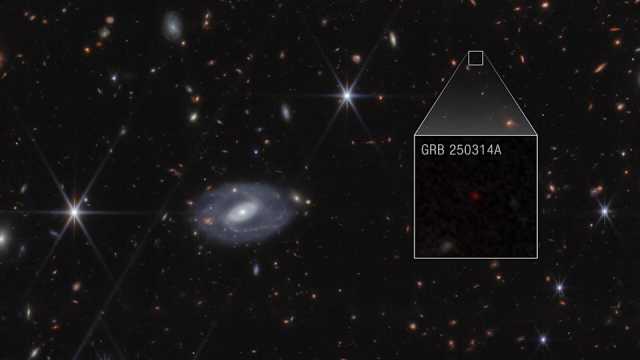 ويظهر المستعر الأعظم في الصور التي التقطها التلسكوب على شكل نقطة حمراء صغيرة داخل مربع مُكبّر على يمين الصورة، وعُرف باسم GRB 250314A.