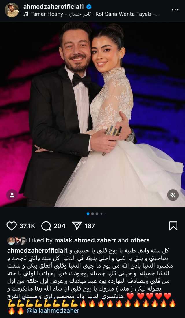 ونشر أحمد زاهر صور له مع ابنته عبر حسابه الشخصي بموقع إنستجرام، وعلق عليها قائلًا: “كل سنة وانتي طيبه يا روح قلبي يا حبيبتي و صاحبتي وبنتي يا اغلي و احلي بنوته في الدنيا كل سنه وانتي ناجحه و مكسره الدنيا باذن اللّٰه من يوم ما جيتي الدنيا وقلبي أتعلق بيكي و شفت الدنيا جميله وحياتي كلها جميله بوجودك فيها بحبك يا لولتي يا حته من قلبي ويصادف النهارده يوم عيد ميلادك و عرض اول حلقه من اول بطوله ليكي ( هند ) مبروك يا روح قلبي ان شاء اللّٰه ربنا هايكرمك وهاتكسري الدنيا وانا متحمس اوي و مستني اتفرج”.