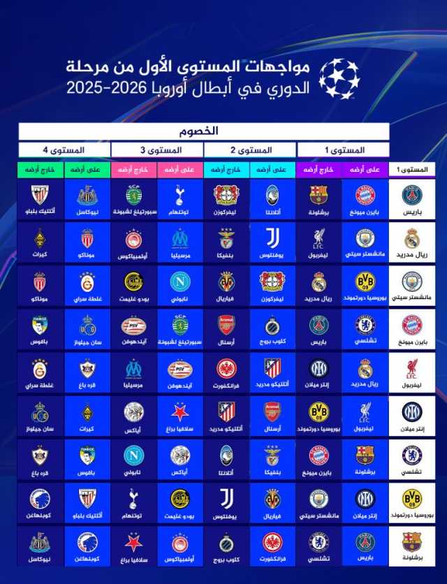 جدول وتوقيت مباريات مرحلة الدوري من دوري أبطال أوروبا: (مكة المكرمة)الجولة الأولىالثلاثاء 16 سبتمبر/أيلول 2025