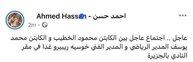 وكتب أحمد حسن على حسابه الشخصي على فيسبوك: “اجتماع عاجل بين الكابتن محمود الخطيب و الكابتن محمد يوسف المدير الرياضي و المدير الفني خوسيه ريبيرو غدا في مقر النادي بالجزيرة”.