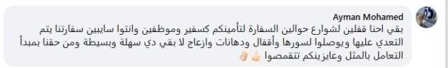 وأضاف ثالث: «بقى احنا قافلين الشوارع حوالين السفارة لتأمينكم كسفير وموظفين، وإنتم سايبين سفارتنا يتم التعدي عليها، ويوصلوا لسورها وأقفال ودهانات وإزعاج.. لا بقى دي سهلة وبسيطة، ومن حقنا بمبدأ التعامل بالمثل وعايزينكم تتقمصوا».