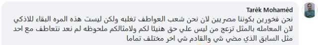 وكتب آخر: «نحن فخورون بكوننا مصريين، لأننا شعب تغلبه العواطف، ولكن ليست هذه المرة، فالبقاء للأذكى والأقوى، ولأن المعاملة بالمثل تزعج من ليس على حق.. فهنيئا لكم ولأمثالكم»، مضيفا:« ملحوظة: لم نعد نتعاطف مع أحد مثل السابق، الذي مضى شيء، والقادم شي آخر مختلف تماما».