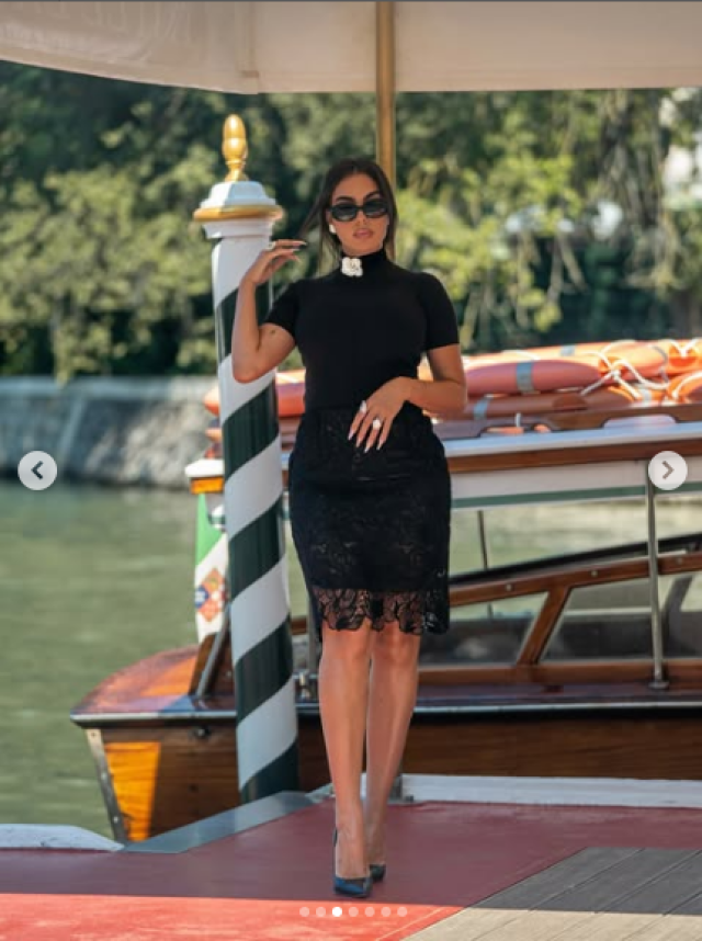 تألقت جورجينا في الصور بإطلالة راقية كعادتها، حيث ارتدت فستان قصير يصل إلي حدود الركبة ونصف كم، واتسم التصميم بالقماش الأسود المصنوع من الدانتيل.