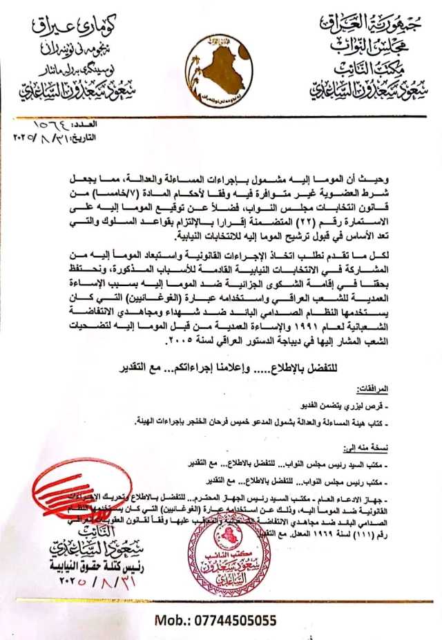 آخر تحديث: 1 شتنبر 2025 - 10:26 ص بغداد/ شبكة أخبار العراق- قال المكتب الإعلامي للنائب عن ميليشيا كتائب حزب الله سعود الساعدي، في بيان ،الاثنين، إن “النائب قدم شكوى ضد خميس فرحان الخنجر، وذلك لإساءته المتعمدة للشيعة الولائية من خلال استخدامه عبارة (الغوغائيين) التي كان يستخدمها النظام السابق ضد الانتفاضة الشعبانية”.