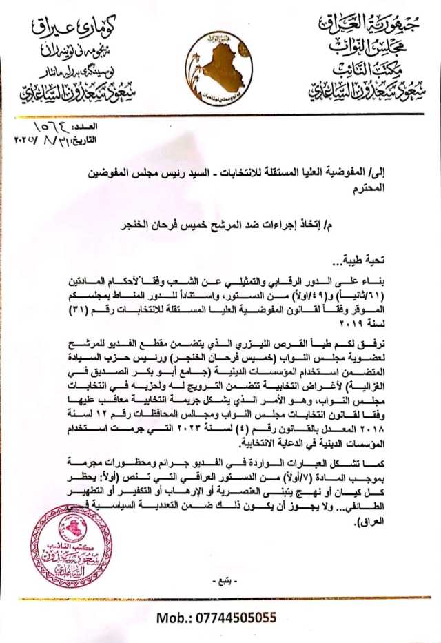 وأضاف أن “تبني هكذا خطاب يمس مشاعر الشيعة الولائية ولا يمكن أن يكون ضمن التعددية السياسية في العراق”، مطالبا رئيس مجلس المفوضين في المفوضية العليا المستقلة للانتخابات بـ”اتخاذ الإجراءات القانونية واستبعاد المرشح للانتخابات رئيس حزب السيادة خميس فرحان الخنجر من المشاركة في الانتخابات النيابية”.وجاء في الكتاب الرسمي أن “الخنجر استخدم المؤسسات الدينية (جامع أبوبكر الصديق في منطقة الغزالية) لأغراض انتخابية تتضمن الترويج له ولحزبه في انتخابات مجلس النواب، الأمر الذي يشكل جريمة يعاقب عليها قانون انتخابات مجلس النواب ومجالس المحافظات”.وخلال اليومين الماضيين، أثار رئيس حزب السيادة خميس الخنجر، جدلا كبيرا، عبر ظهوره بمقطع فيديو في خطبة له داخل جامع، وكان يتحدث عن انقاذ أبناء المكون السني، وعدم تركهم لـ”الغوغائيين”.
