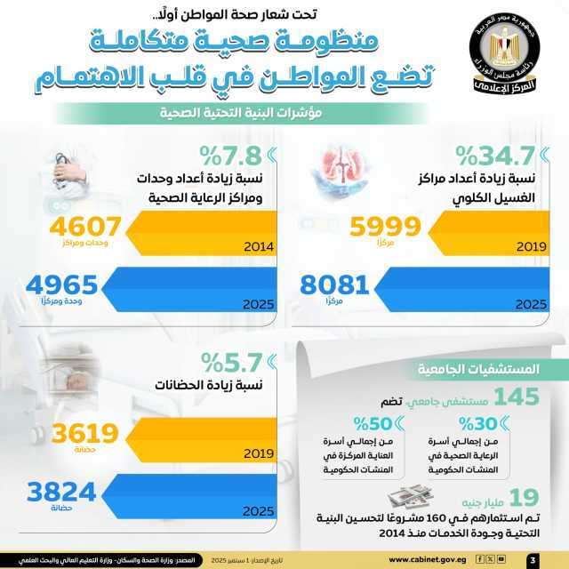 وعلى صعيد مؤشرات البنية التحتية الصحية، أظهرت الإنفوجرافات زيادة أعداد مراكز الغسيل الكلوي بنسبة 34.7%، لتصل إلى 8081 مركزًا عام 2025، مقارنة بـ 5999 مركزًا عام 2019، كما زادت أعداد وحدات ومراكز الرعاية الصحية بنسبة 7.8%، لتصل إلى 4965 وحدة ومركز عام 2025، مقابل 4607 وحدات ومراكز عام 2014.