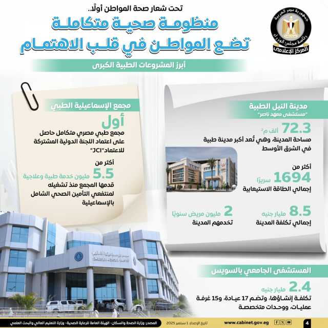 نشر المركز الإعلامي لمجلس الوزراء عددًا من الإنفوجرافات عبر منصاته على مواقع التواصل الاجتماعي، استعرض من خلالها التطوير الذي شهدته المنظومة الصحية، والتي تضع المواطن في صدارة الاهتمام، وذلك تحت شعار "صحة المواطن أولًا".