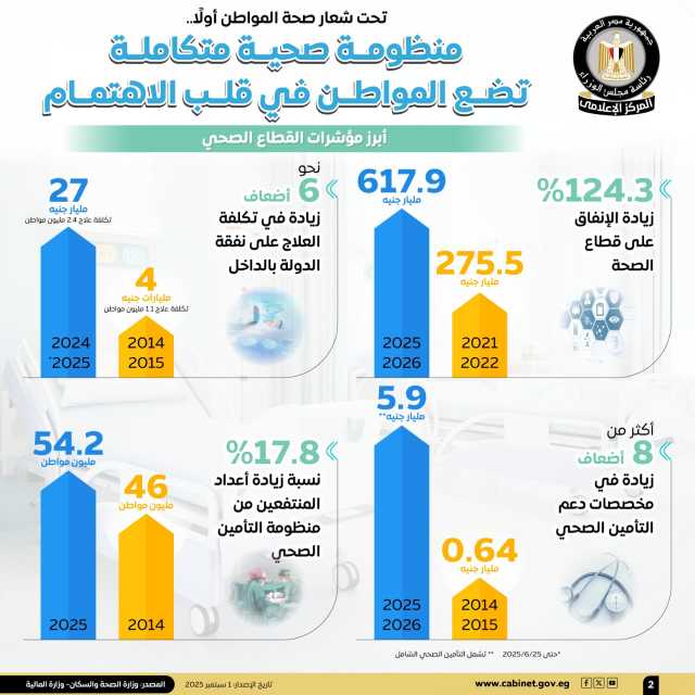 وأشارت الإنفوجرافات إلى زيادة مخصصات دعم التأمين الصحي لأكثر من 8 أضعاف، لتصل إلى 5.9 مليار جنيه عام 2025/2026 "تشمل التأمين الصحي الشامل"، مقارنة بـ 0.64 مليار جنيه عام 2014/2015، كما زادت أعداد المنتفعين من منظومة التأمين الصحي بنسبة 17.8%، لتصل إلى 54.2 مليون مواطن عام 2025، مقابل 46 مليون مواطن عام 2014.
