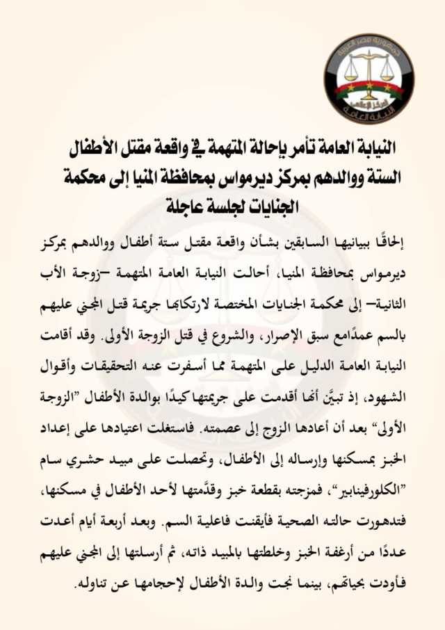 فقد أصدرت النيابه العامه بيانا قالت فيه " إلحاقًا ببيانيها السابقين بشأن واقعة مقتل 6 أطفال ووالدهم بمركز ديرمواس، أحالت النيابة العامة المتهمة –زوجة الأب الثانية– إلى محكمة الجنايات المختصة لارتكابها جريمة قتل المجني عليهم بالسم عمدًا مع سبق الإصرار، والشروع في قتل الزوجة الأولى.