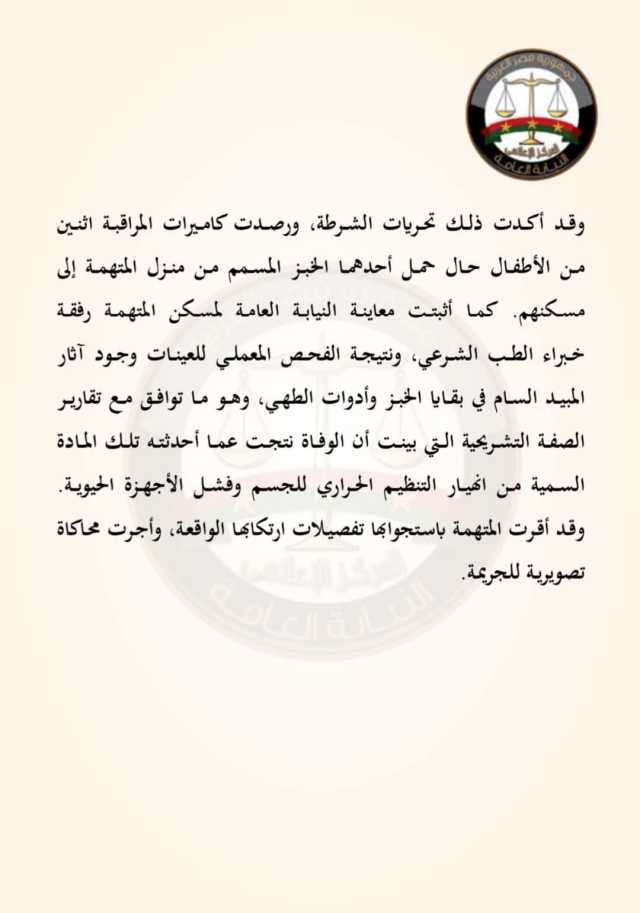 وقد أكدت ذلك تحريات الشرطة، ورصدت كاميرات المراقبة اثنين من الأطفال حال حمل أحدهما الخبز المسمم من منزل المتهمة إلى مسكنهم.