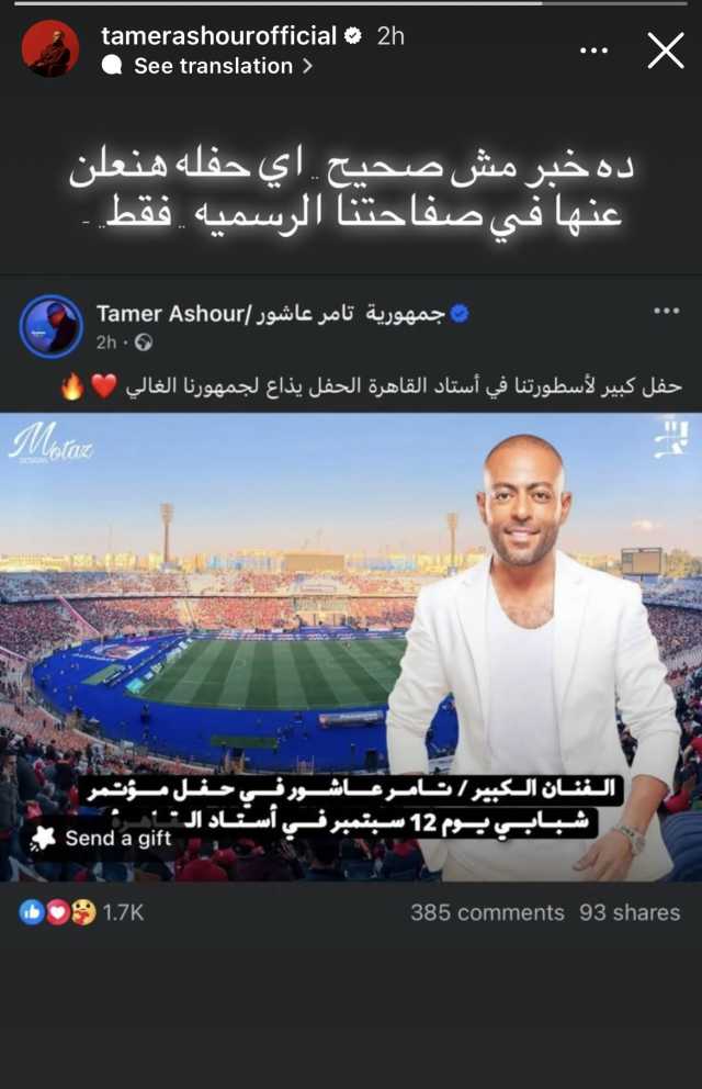 نفى الفنان تامر عاشور، خبر إقامة حفل على ستاد القاهرة الدولي، من خلال حسابه الرسمي على موقع التواصل الاجتماعي انستجرام.