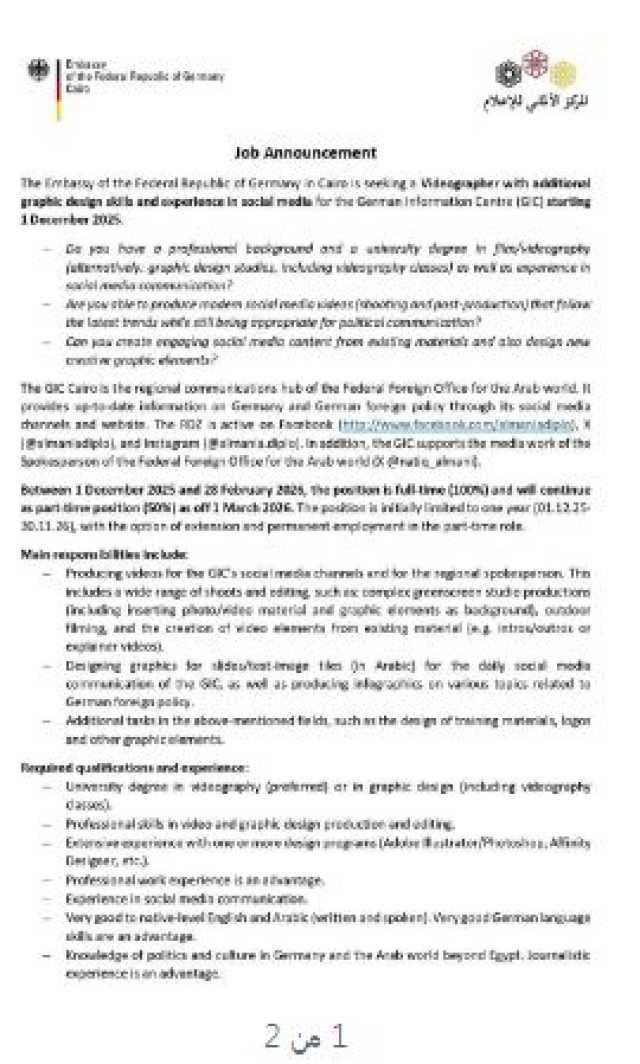 أعلنت السفارة الألمانية بالقاهرة عن وظيفة شاغرة وهي مصور فيديو يتمتع بمهارات في تصميم الجرافيك وخبرة في وسائل التواصل الاجتماعي للعمل في المركز الألماني للإعلام، وذلك اعتبارًا من 1 ديسمبر.
