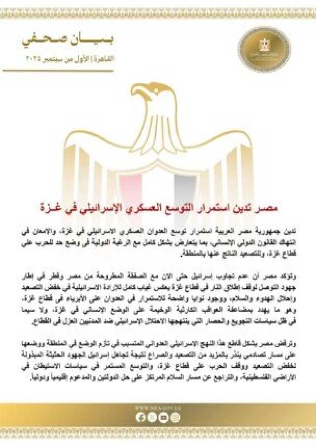 وأكدت القاهرة رفضها القاطع للنهج العدواني الذي تنتهجه إسرائيل، محذرة من أن تجاهل الجهود المبذولة لوقف الحرب يضع المنطقة على مسار تصادمي خطير ينذر بمزيد من التصعيد والصراع، إلى جانب التوسع في الاستيطان والتراجع عن مسار السلام القائم على حل الدولتين والمدعوم إقليميًا ودوليًا.