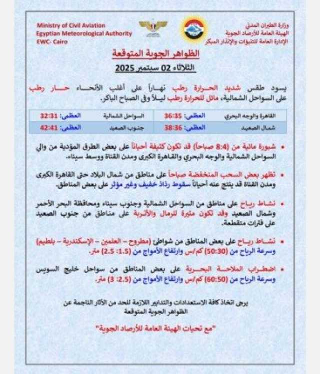 اقرأ أيضاًتحول مفاجئ.. الأرصاد تعلن حالة الطقس اليوم الإثنين 1 سبتمبر 2025