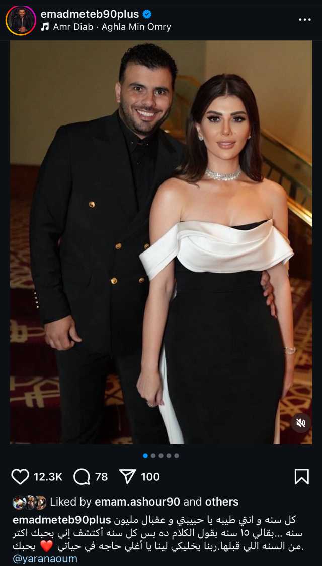 ونشر متعب عدة صور تجمعهما سويًا عبر حسابه الشخصي بموقع إنستجرام وعلق عليها قائلًا: “كل سنة وانتى طيبة يا حبيبتى وعقبال مليون سنة، بقالي ١٥ سنة بقول الكلام دة بس كل سنة اكتشف إني بحبك أكتر من السنة اللي قبلها، ربنا يخليكى لينا يا أغلى حاجة فى حياتي، بحبك”.