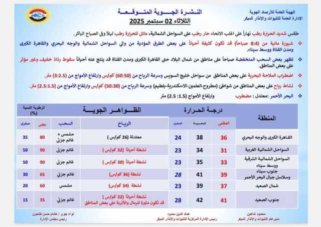 يتوقع خبراء هيئة الأرصاد الجوية أن يسود، اليوم الثلاثاء، طقس شديد الحرارة رطب نهارا على القاهرة الكبرى والوجه البحري وجنوب سيناء وجنوب البلاد، حار رطب على السواحل الشمالية..بينما يسود طقس مائل للحرارة رطب ليلا على أغلب الأنحاء.