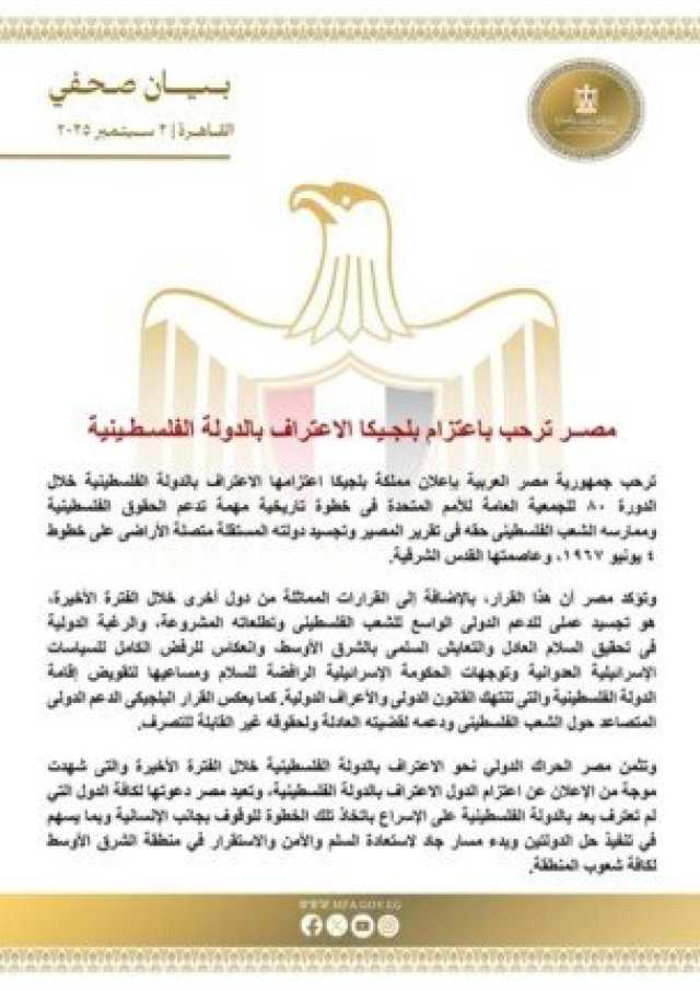 ترحب مصر بإعلان مملكة بلجيكا اعتزامها الاعتراف بالدولة الفلسطينية خلال الدورة 80 للجمعية العامة للأمم المتحدة في خطوة تاريخية مهمة تدعم الحقوق الفلسطينية وممارسة الشعب الفلسطيني حقه في تقرير المصير وتجسيد دولته المستقلة متصلة الأراضي على خطوط يونيو 1967، وعاصمتها القدس الشرقية.