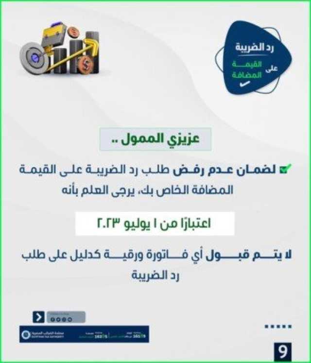 وأوضح الإنفوجراف أنه لضمان عدم رفض طلب رد الضريبة على القيمة المضافة، يرجى العلم بأنه اعتبارا من 1 يوليو 2023، لا يتم قبول أية فاتورة ورقية كدليل على طلب رد الضريبة.
