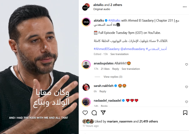 شارك الفنان أحمد السعدني جمهوره مقطعاً من البرومو الخاص بحلقته الجديدة مع الإعلامي الإماراتي أنس بو خش في برنامجه الشهير ABtalks، والذي كشف من خلاله عن جانب إنساني مؤثر من حياته الشخصية، متحدثاً لأول مرة بصدق وشفافية عن المرحلة العصيبة التي عاشها عقب وفاة طليقته ووالدة أولاده، الراحلة أمل سليمان.