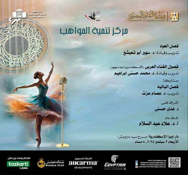 تقدم دار الأوبرا المصرية برئاسة الدكتور علاء عبد السلام حفلاً للواعدين بمركز تنمية المواهب بأوبرا الأسكندرية ودمنهور تحت إشراف الدكتورة هدى حسنى .