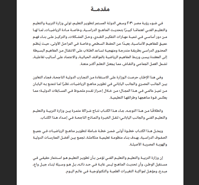 يتميز بالبساطة، وأسلوبه يشجع الطلاب على الإقبال على التعلم، ويجعلهم يجدون فيه المتعة والفائدة دون شعور بالنفور أو الملل.رابط تحميل الكتاب الآن على موقع وزارة التربية والتعليم يمكن الوصول إليه من خلال الضغط هناتم عقد ورشة تدريب لمعلمي وموجهي مادة الرياضيات بالمرحلة الابتدائية، والسادة مديري التعليم الابتدائي بمختلف المحافظات، على منهج الرياضيات الجديد للصف الاول الابتدائي المستند إلى التعليم الياباني