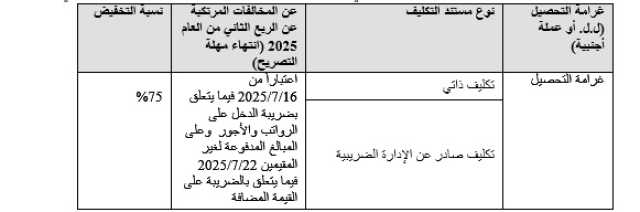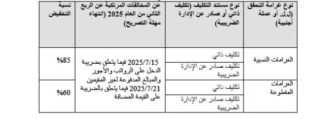 المادة الأولى : خلافاً لأي نص آخر، يحدد هذا القرار دقائق تطبيق أحكام البند (3) من المادة الأولى من القانون رقم 662 تاريخ 4/2/2005 المعدل بموجب المادة (22) من القانون النافذ حكماً رقم 10 تاريخ 15/11/2022 (الموازنة العامة للعام 2022) المتعلقة بتخفيض الغرامات المترتبة عن ضريبة الدخل على المبالغ المدفوعة لغير المقيمين أو ضريبة الدخل على الرواتب والأجور أو الضريبة على القيمة المضافة المترتبة عن الربع الثاني من العام 2025 على أن تراعى في التطبيق أحكام المادتين الثانية والثالثة من القانون المذكور أعلاه.