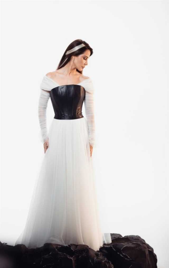 وبدت نانسي عجرم بإطلالة ساحرة، مزجت بين الرقي والجاذبية في آن واحد، مرتدية فستان طويل مجسم من أعلى ينتمي لصيحة الكورسية وفضفاض من أسفل، صمم من قماش التل الناعم باللون الأبيض مع قماش الجلد اللون لتواكب موضة فساتين 2025.