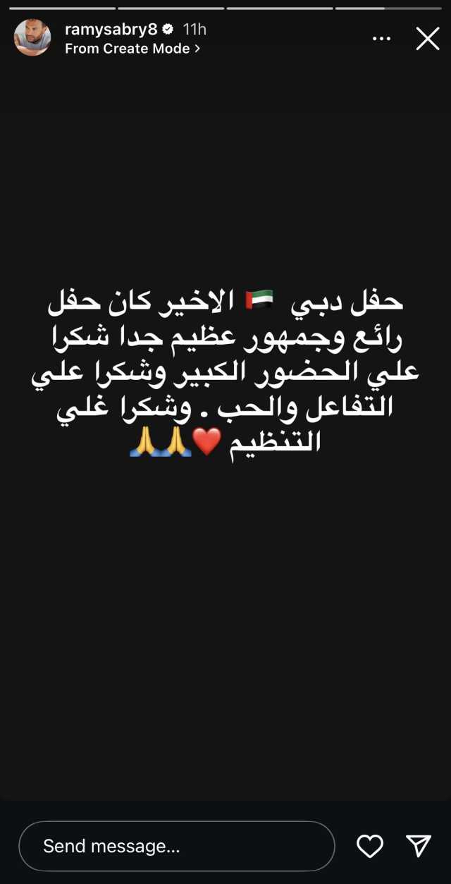 وكتب رامي صبري عبر الاستوري: “حفل دبي الاخير كان حفل رائع وجمهور عظيم جدا شكرا على الحضور الكبير وشكرا على التفاعل والحب وشكرا على التنظيم”.
