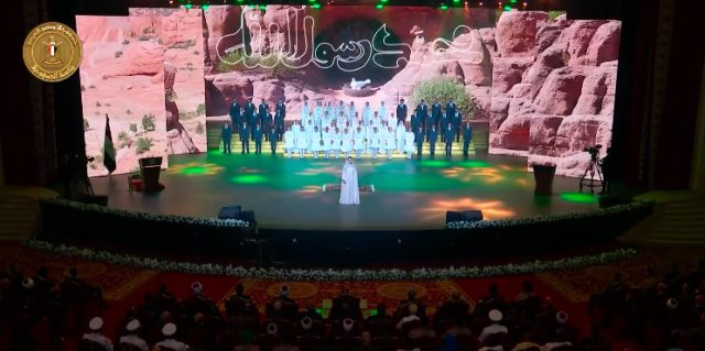 وقدمت المطربة ريهام عبد الحكيم خلال الاحتفالية أنشودة “محمد يا رسول الله” من كلمات الشاعر عبد الفتاح مصطفى، وألحان وتوزيع الموسيقار جمال سلامة، وهي أنشودة ذات طابع روحاني نالت تفاعل الحاضرين وإشادة واسعة من الجمهور.