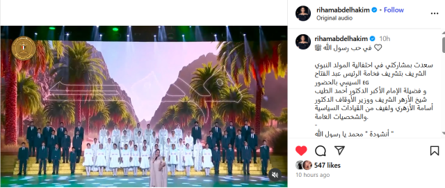 وقالت ريهام عبدالحكيم: “في حب رسول الله.. سعدت بمشاركتي في احتفالية المولد النبوي الشريف بتشريف الرئيس عبدالفتاح السيسي بالحضور، وفضيلة الإمام الأكبر الدكتور أحمد الطيب، ووزير الأوقاف الدكتور أسامة الأزهري، ولفيف من القيادات السياسية والشخصيات العامة”.