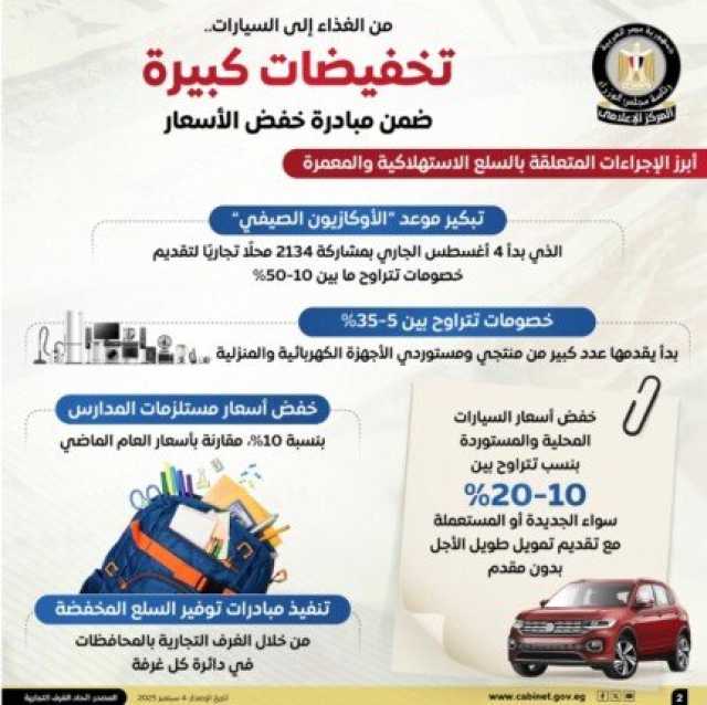 اقرأ أيضاًمجلس الوزراء يعلن انخفاض أسعار السيارات المحلية والمستوردة والمستعملة