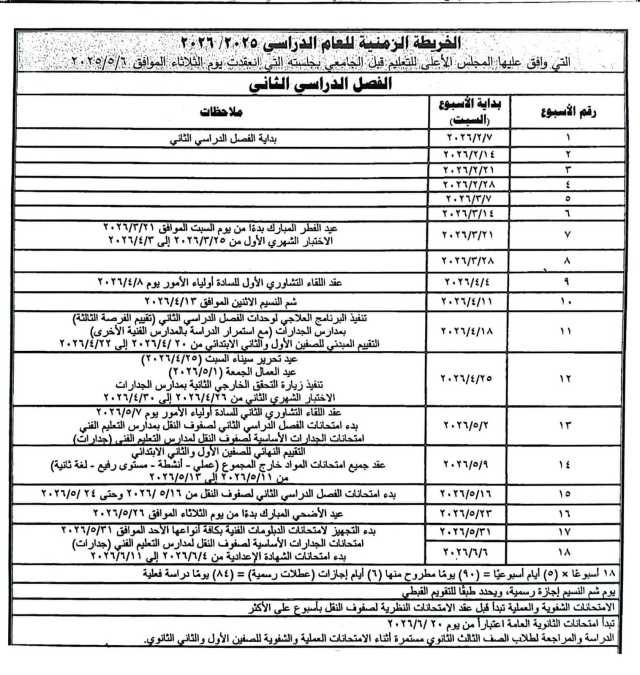 - بدء امتحانات الفصل الدراسي الثاني 2026 لصفوف النقل من 16 مايو 2026 حتى 24 مايو 2026