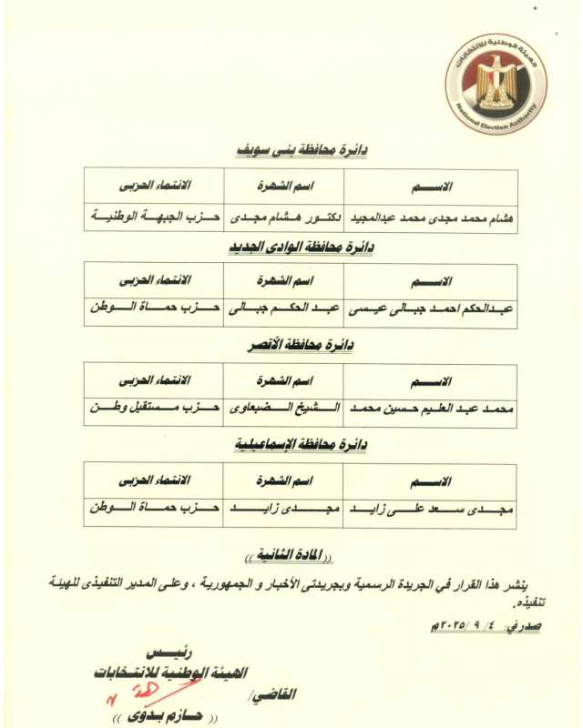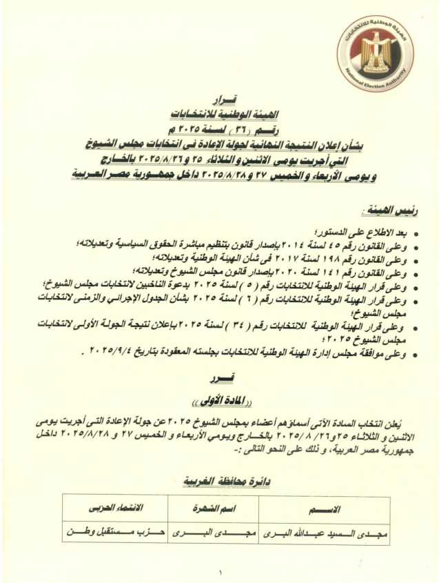 أعلنت الهيئة الوطنية للانتخابات، برئاسة القاضي حازم بدوى ، نتيجة جولة الإعادة من انتخابات مجلس الشيوخ 2025، التي جرت في 5 محافظات، وتنافس فيها 10 مرشحين على 5 مقاعد، وبلغت نسبة المشاركة 7.68%، بعدد أصوات 600 ألف و965 ناخبا من أصل 7821517 ناخبا يحق لهم التصويت في هذه الانتخابات، فوز 5 مرشحين الغربية، وبنى سويف، والاسماعيلية، والاقصر، والوادي الجديد.