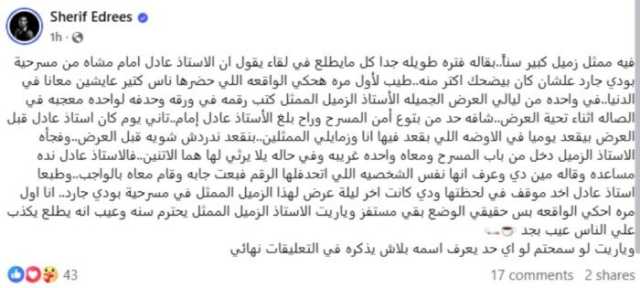 كما أضاف: «طيب لأول مرة هحكي الواقعة اللي حضرها ناس كتير عايشين معانا.. في واحدة من ليالي العرض الجميلة، الأستاذ الزميل الممثل كتب رقمه في ورقة وحدفه لمعجبة في الصالة أثناء تحية العرض. شافه واحد من أفراد أمن المسرح وراح بلغ الأستاذ عادل إمام».