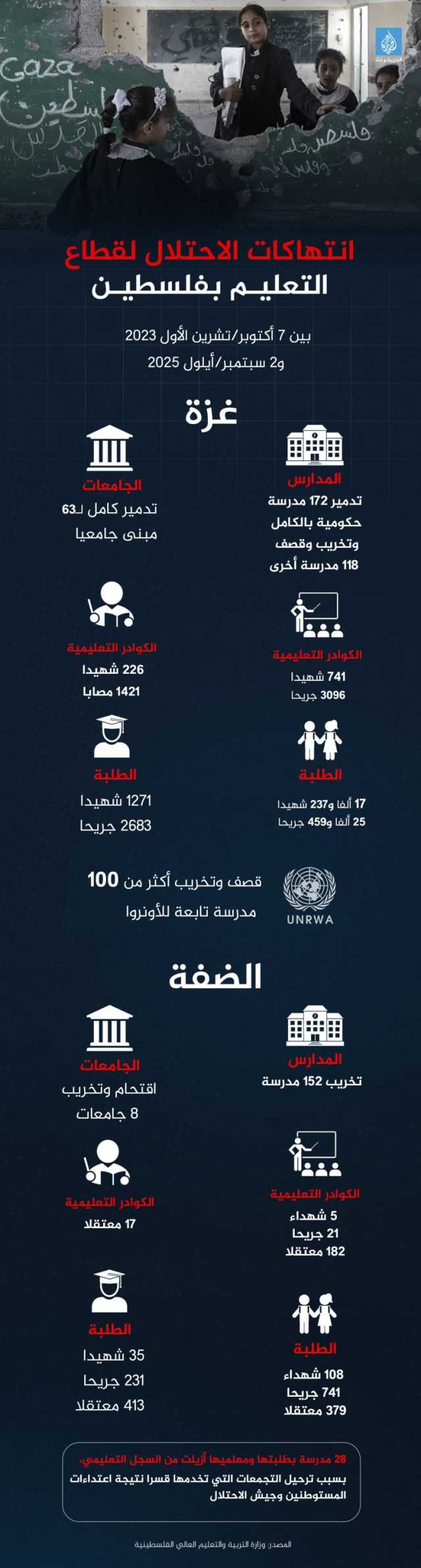 طالت انتهاكات الاحتلال منذ بدء حرب الإبادة في 7 أكتوبر 2023 قطاع التعليم بمختلف مكوناته، بما فيها المدارس والجامعات التي فقدت 18 ألفا و877 من طلبتها وكوادرها التعليمية، إضافة إلى 33 ألفا و652 جريحا.