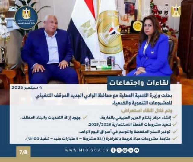استقبلت الدكتورة منال عوض، وزيرة التنمية المحلية والقائم بأعمال وزير البيئة ، اللواء محمد الزملوط، محافظ الوادي الجديد، بمقر الوزارة بالعاصمة الإدارية الجديدة، لبحث الموقف التنفيذي للمشروعات التنموية والخدمية التي يجري تنفيذها بالمحافظة في مختلف المجالات ، بما يساهم في تحسين جودة الخدمات المقدمة للمواطنين.