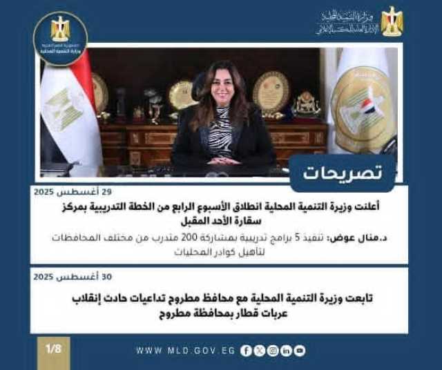 أعلنت الدكتورة منال عوض وزيرة التنمية المحلية، عن انطلاق الأسبوع التدريبي الرابع من الخطة التدريبية للمحليات للعام المالي 2025 – 2026، حيث يتم تنفيذ 5 برامج تدريبية بمشاركة نحو 200 متدرب من العاملين في الإدارات المحلية بمختلف المحافظات، وذلك خلال الفترة من 31 أغسطس وحتى 4 سبتمبر 2025 بمركز التنمية المحلية للتدريب بسقارة.