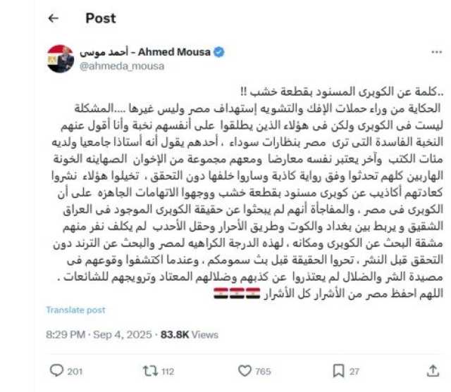 وأوضح موسى: «لم يكلف نفر منهم مشقة البحث عن الكوبرى ومكانه، لهذه الدرجة الكراهية لمصر والبحث عن الترند دون التحقق قبل النشر، تحروا الحقيقة قبل بث سمومكم، وعندما اكتشفوا وقوعهم في مصيدة الشر والضلال لم يعتذروا عن كذبهم وضلالهم المعتاد وترويجهم للشائعات».