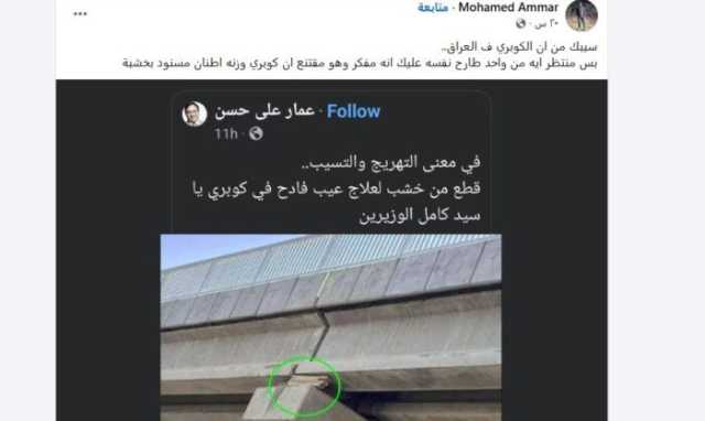 تعليقات رواد مواقع التواصلوفي التعليقات قال أحد الأشخاص: «سيبك من أن الكوبري في العراق، بس منتظر أي من واحد طارح نفسه عليك إنه مفكر وهو مقتنع أن كوبري وزنه أطنان مسنود بخشبة»، بينما أضاف آخر: «عمار علي حسن جايب صورة من جسر الأحرار في محافظة الكوت بالعراق، وعايز يحاسب الفريق كامل الوزير عليها».
