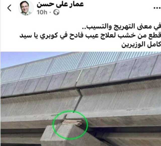 ونشر «عمار علي حسن» عبر حسابه على فيسبوك صورة للكوبري مع وضع علامات دائرية حول القطع الخشبية المتواجدة بين الأعمدة والطبقة العلوية للكوبري، وعلق عليها: «قطع من خشب لعلاج عيب فادح في كوبري».