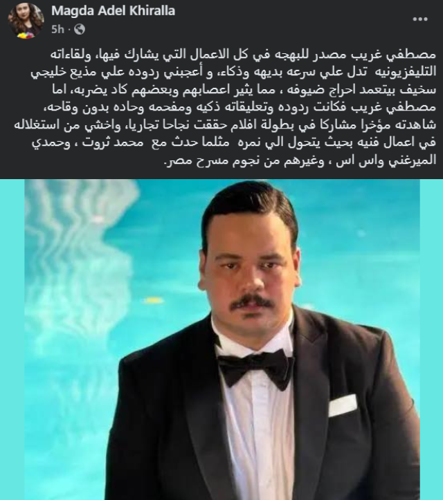 أعربت الناقدة ماجدة خير الله عن تخوفها الشديد من استغلال الفنان مصطفى غريب في أعماله الفنية مثلما حدث مع نجوم مسرح مصر، موجهة له رسالة خاصة خلال منشور عبر حسابها الشخصي بموقع التواصل الإجتماعي الأشهر "فيس بوك".